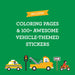 Colour in the vehicle scenes featuring cars, diggers, tractors, and a road full of vehicles on the move! When you're done, decorate them with over 100 vehicle-themed stickers that can be used to bring the finishing touch to your vehicle creations!