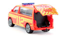 Detailed toy model of the VW T5 fire service command vehicle with new printing - perfect for playing and collecting for fire service fans of all ages. The robust model features a sturdy metal body and rubberised tyres for excellent rolling characteristics. The tailgate can be opened and a trailer coupling enables exciting combinations with other trailers on the same scale.