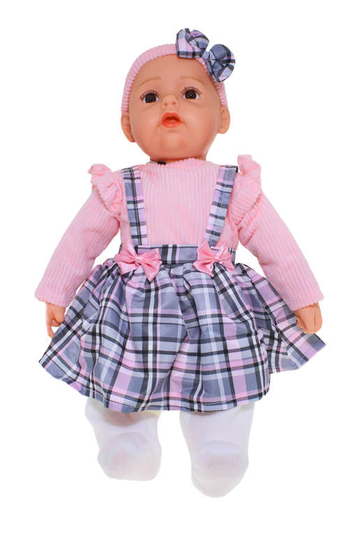Meet Baby Doll Harper, dressed in an adorable Pink and Grey Tartan skirt outfit with a matching headband. Her delightfully soft body is perfect f...