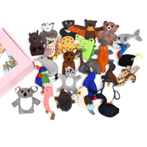This big Australian Animals finger puppet set consists of a Barking owl, Bower bird, Bilby, Black swan, Blue-ringed octopus, Cassowary, Cockatoo, C...