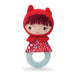 Styled in her sweet cape and fringe she adds an extra layer of sensory stimulation with the subtle 'bell' and 'crinkle' sounds, and the ridges on the silicon ring are perfect to assist with teething days. This teething rattle matching other Red Riding Hood items in the Lilliputiens range.