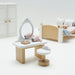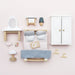 A painted wooden bedroom set that features a classic design in lovely neutral tones. Compatible with all of the Le Toy Van wooden dolls houses. Crafted from FSCâ certified wood, a restful nights sleep beckons thanks to the comfy double bed, complete with cosy quilt and squishy pillows - all topped off with a stylish throw and wooden tray for serving up a delicious breakfast in bed. There's also a smart wardrobe with coat hangers, a bedside table with lamp, plus, a gorgeous dressing table, stool and accessories for acting out petit pampering sessions. Dimensions: Wardrobe - 10.5cm x 5.8cm x 14.8cm